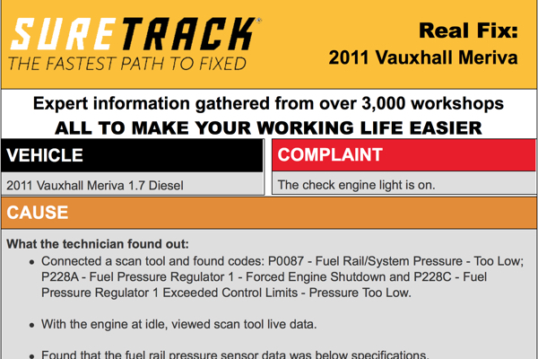 Een Opel Meriva 1.7-liter diesel van bouwjaar 2011 komt de werkplaats binnen met een brandend motor-waarschuwingslampje. De monteur sluit de scantool aan en constateert foutcodes P0087, P228A en P228C. Dankzij Snap-on SureTrack hoeft hij echter geen diepgaand onderzoek in te stellen en komt hij snel tot de oorzaak van het probleem. Foutcode + omschrijving Opel […]