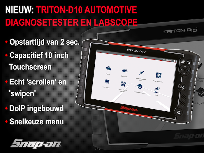 Snap-on introduceert de Triton-D10 diagnosetester. De Triton-D10 is de krachtigste, meest intuïtieve en snelste gecombineerde voertuig-diagnose scanner met tweekanaals labscope die Snap-on Tools tot nu toe op de markt heeft gebracht. De Triton-D10 is specifiek ontworpen voor universele en merkgebonden autobedrijven die snel alle voertuigsystemen willen uitlezen, storingen willen opsporen, elektronische componenten in wil leren […]